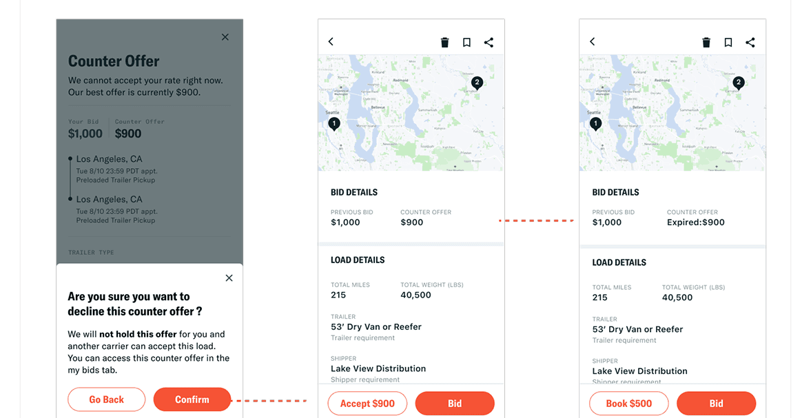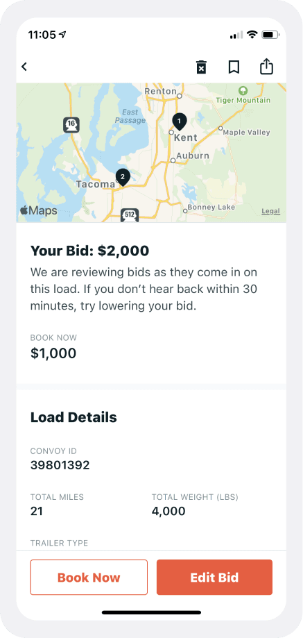 The Convoy Carrier App connects drivers and fleets to a digital freight marketplace, allowing them to find, bid, and manage loads in real time. My design work focused on improving booking flows, visibility, and feedback loops to reduce driver downtime and increase trust in automated bidding systems.